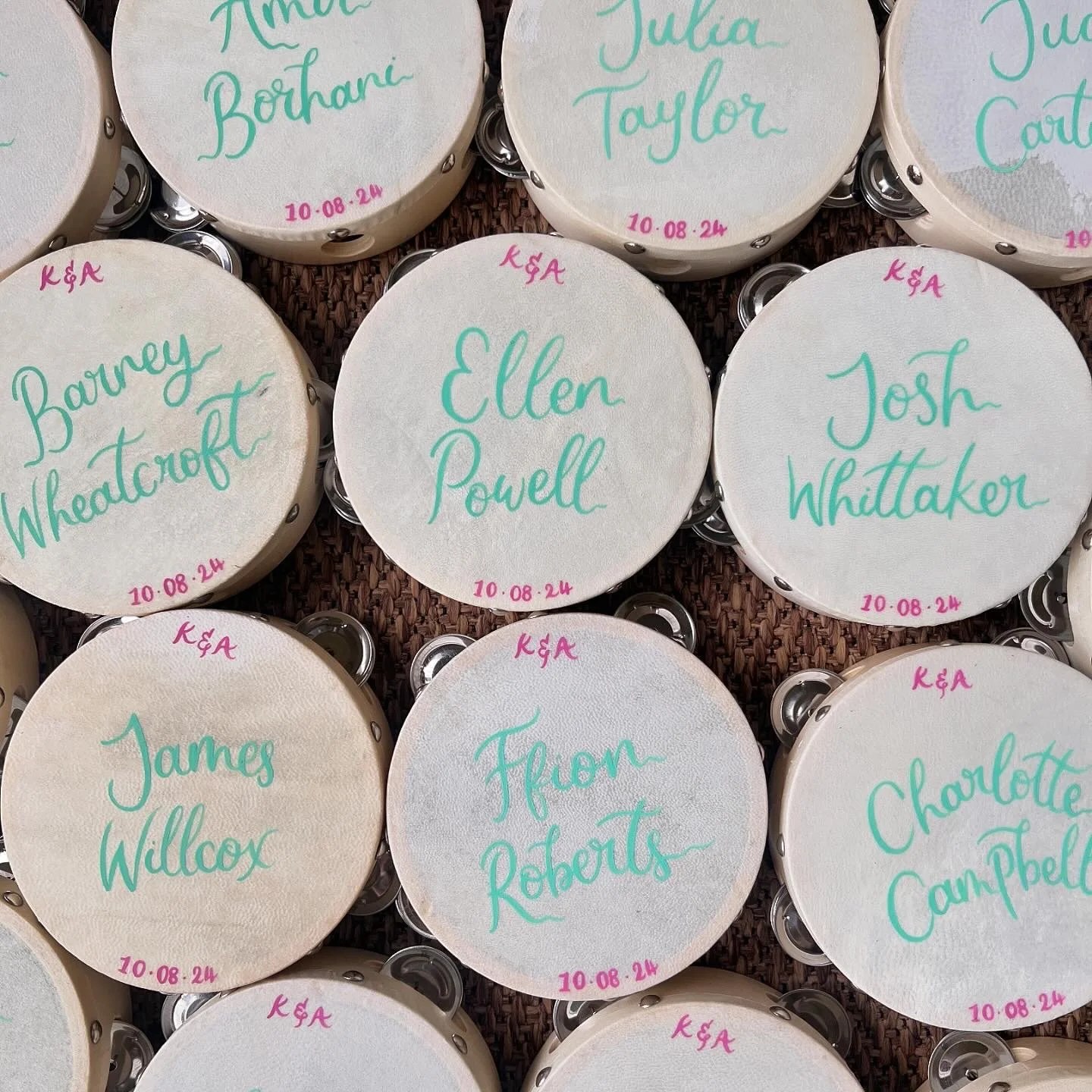 Bespoke and hand-painted luxury tambourines finished with satin ribbons.